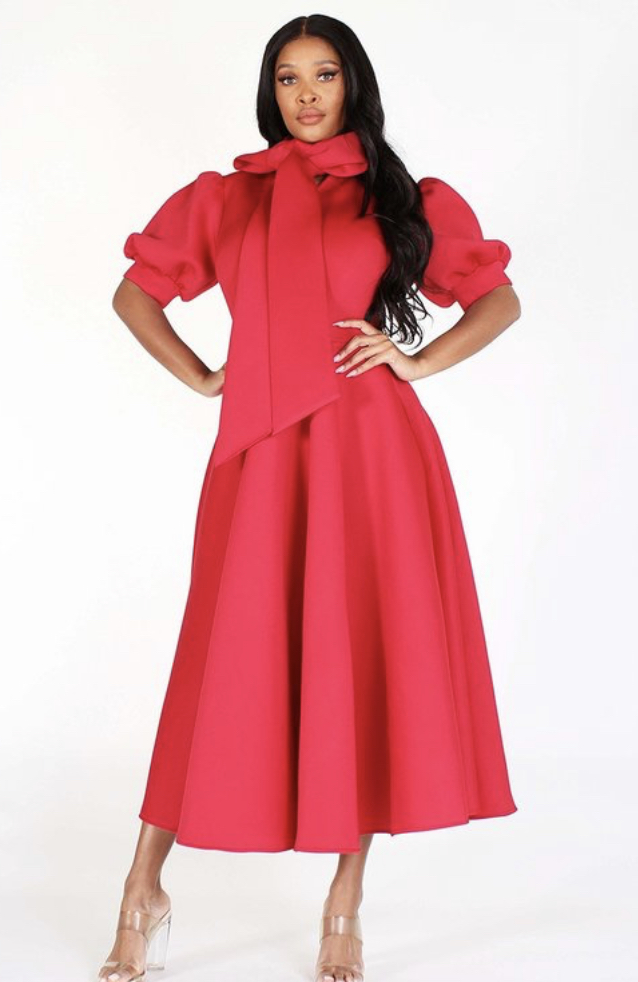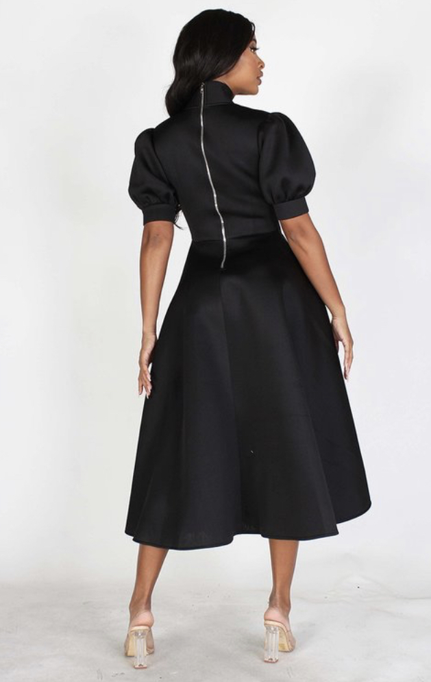 “Miss Character” Black Petite Short Bubble Sleeve, Neck Bow Fit And Flair Midi Dress With Pockets And Back Zipper